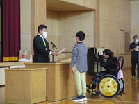 全校朝の会の前に、第22回福島県特別支援学校スポーツ大会の表彰と児童生徒会各委員会役員の任命を行いました。
